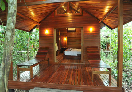The resort is approximately 2.5 hours drive from Sandakan and has the most enviable location. Comprises 15 rooms with each room is hewn and hand-crafted by local tradesman using the Borneo Iron Wood – a rare timber tree native to the Borneo and are exquisitely designed and decorated with local materials to blend harmoniously into the natural landscape of the rainforest.Nestled along the bank of the Kinabatangan River, the resort is surrounded by quaint local village that provides a unique "close to nature" experience with plenty of opportunities for river cruise, jungle trekking, stroll through traditional villages and chance to see the proboscis monkeys, the orang utan, pygmy elephants, the oriental darter, hornbills, kingfishers and many living in their natural habitat.It is a haven for nature lovers and for those who need to retreat into nature, to recharge and to escape to a different reality. With the unique and classic ethnic room designed resembling the typical and traditional village house, the resort rests on the 4ft wooden stilts rising within the nature forest with the cottages scattered among the ancient trees and linked by series of boardwalk with each room comes with its own balcony. It is truly a great escape to enjoy the sounds of nature at its finest.